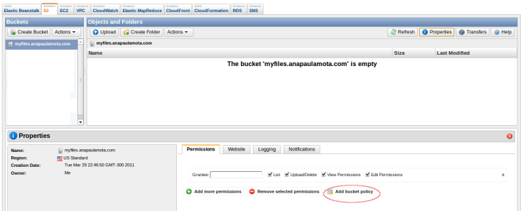 Na parte inferior do console, você poderá ver as informações sobre o bucket como região, nome, data de criação e na aba Permissions encontraremos a opção “Add bucket policy” ou “Edit bucket policy” se você já tiver uma política definida.