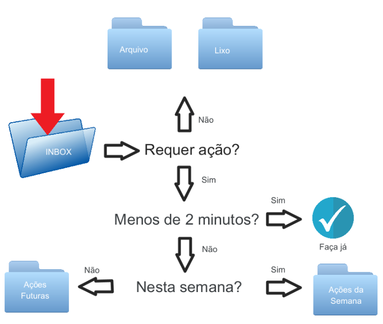 Mais importante do que seguir o fluxo, é entender a ideia por trás dele. É fácil perceber que a sua caixa de entrada passa a ser somente o lugar por onde seus e-mails chegam. Não é o lugar para você guardar pendências, informações importantes e etc. Vamos fazer uma analogia com a caixa de correio. Você vai até a caixa, pega a correspondência e classifica(contas, propagandas, comunicados). Você não vai até a caixa, checa o que chegou e deixa lá para depois tomar alguma ação. Você não usa a sua caixa de correio para armazenar sua correspondência.