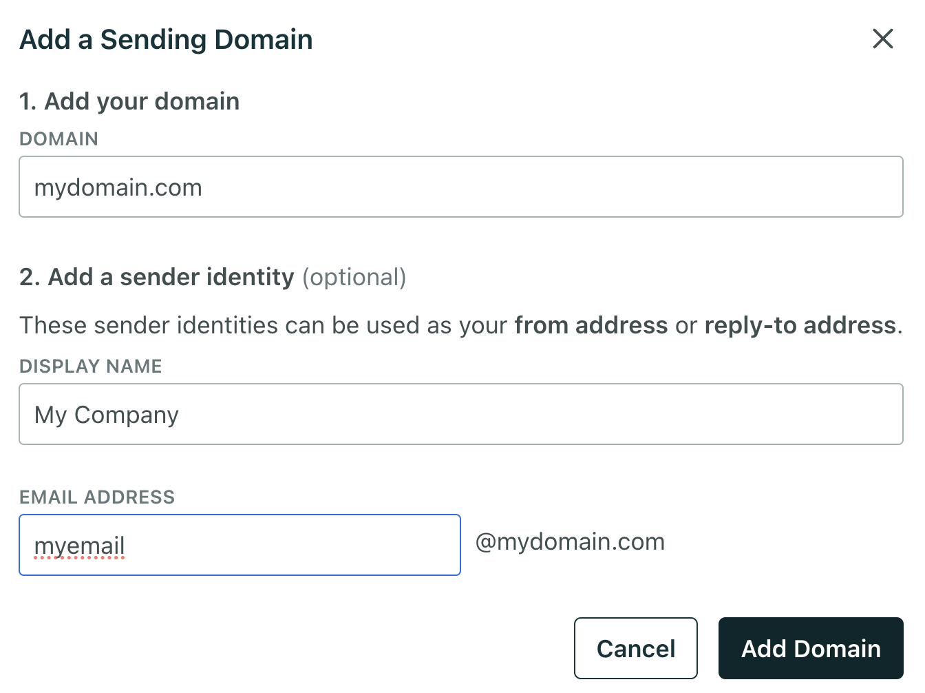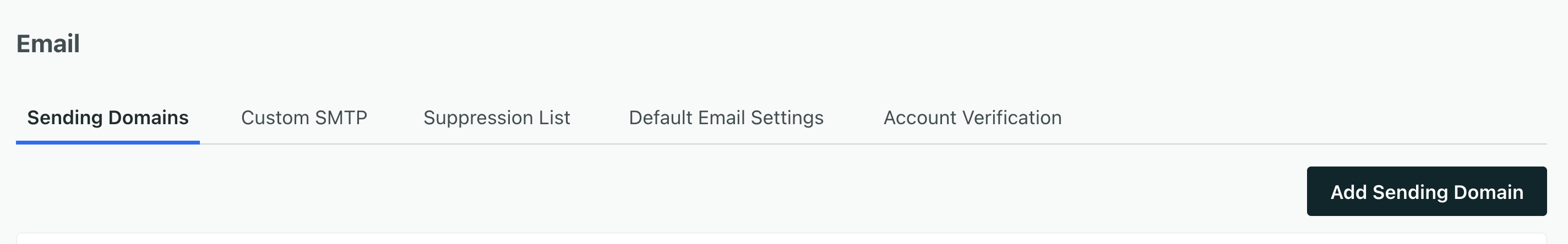 Você verá uma tela com o botão Add Sending Domain. Clique no botão e a tela de configuração será exibida. Informe o domínio, o nome de exibição e o e-mail remetente.