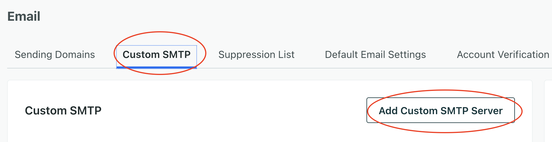 O próximo passo é configurar o SMTP. Clique em Custom SMTP -> Add Custom SMTP Server: